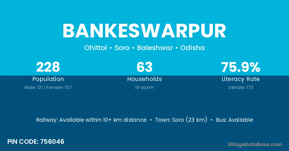 Soro (23 km) is the nearest town to Bankeswarpur village for major economic activities and is located approximately 23 km away.