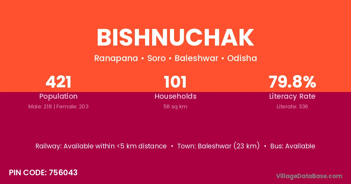 Bishnuchak village has a total population of 421 people, of which 218 are males and 203 are females.