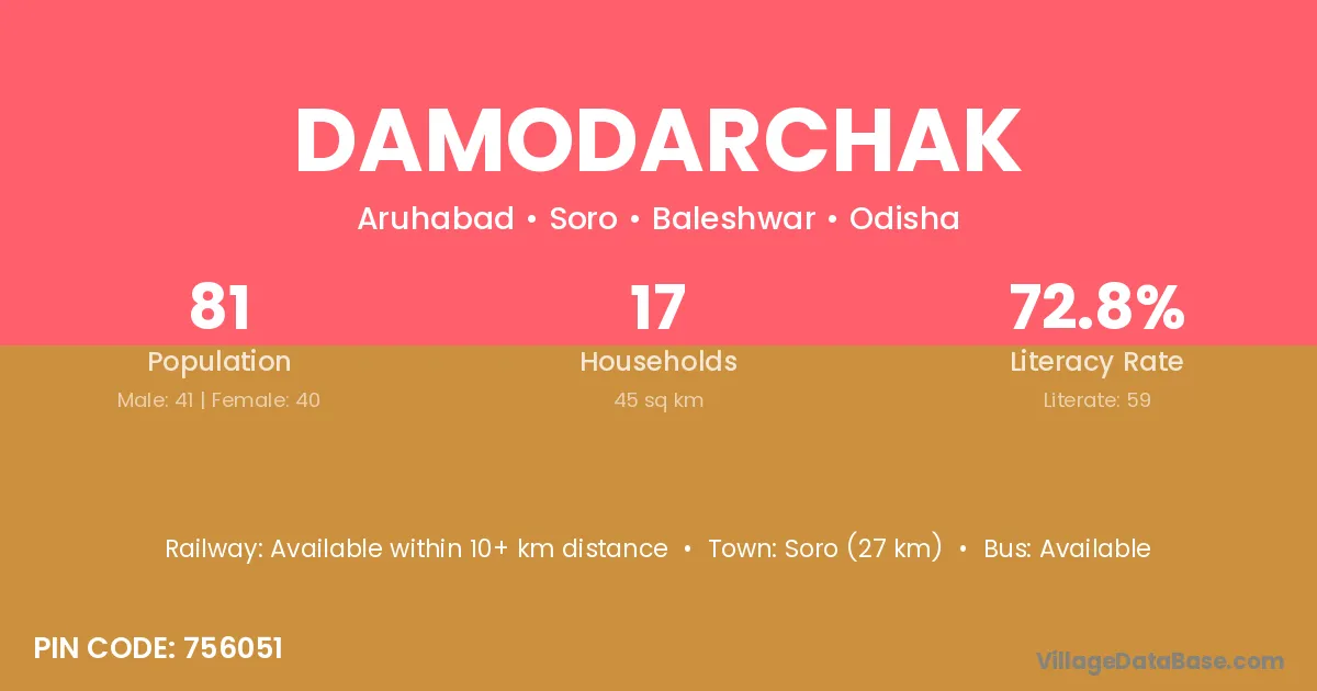 Soro (27 km) is the nearest town to Damodarchak village for major economic activities and is located approximately 27 km away.