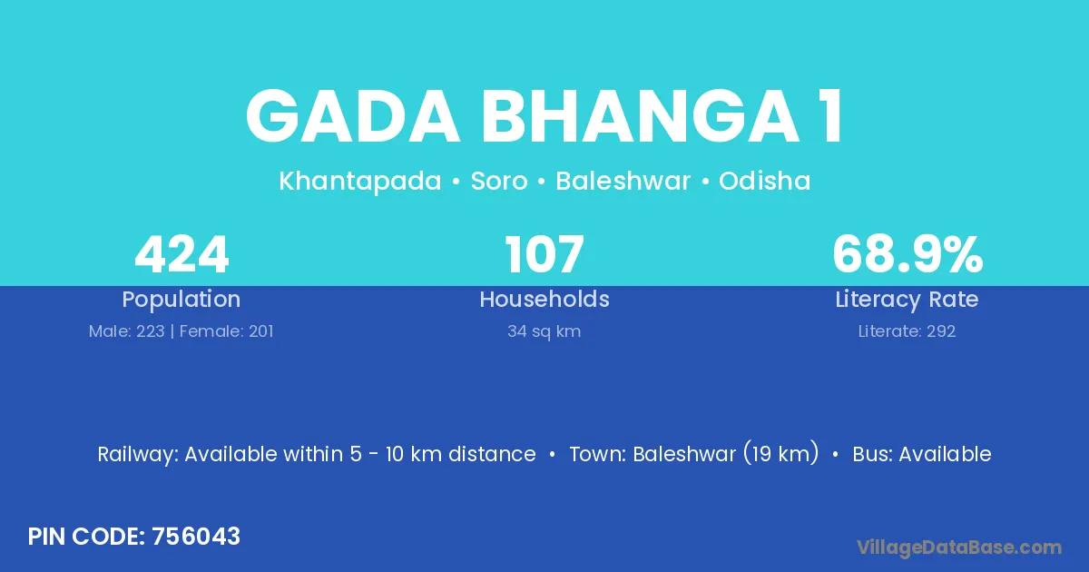 Gada Bhanga 1 village has a total population of 424 people, of which 223 are males and 201 are females.