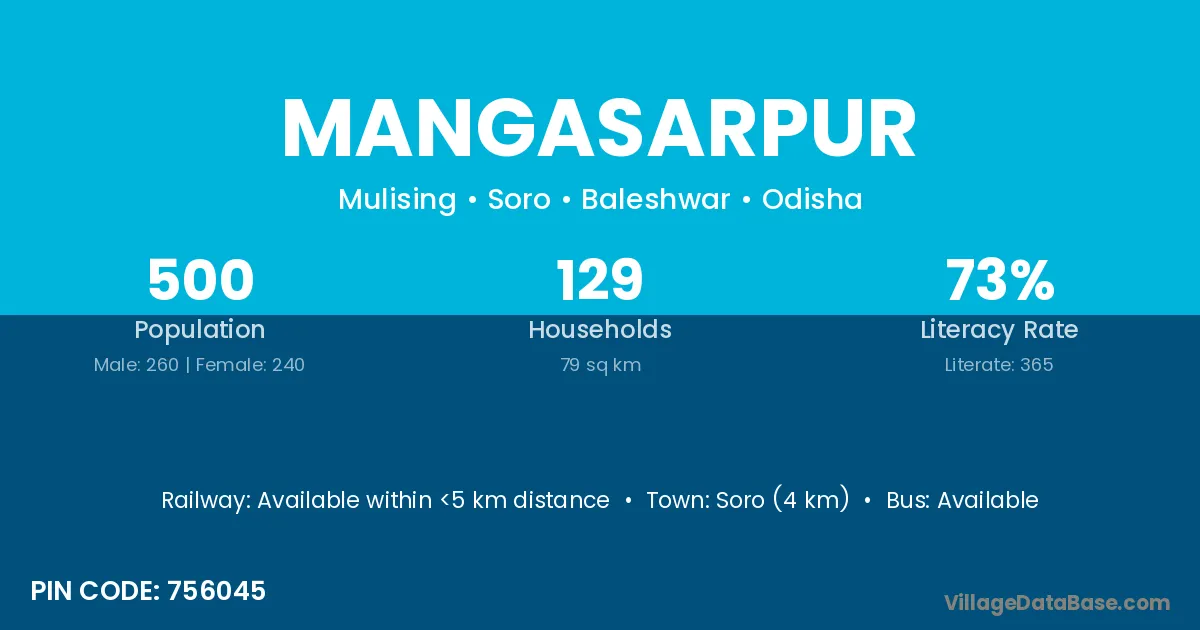 Soro (4 km) is the nearest town to Mangasarpur village for major economic activities and is located approximately 4 km away.