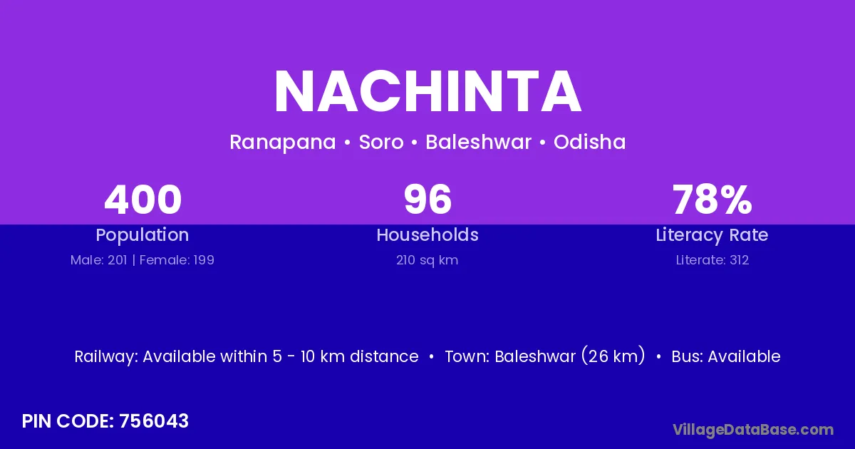 Baleshwar (26 km) is the nearest town to Nachinta village for major economic activities and is located approximately 26 km away.