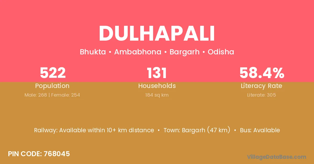 Bargarh (47 km) is the nearest town to Dulhapali village for major economic activities and is located approximately 47 km away.