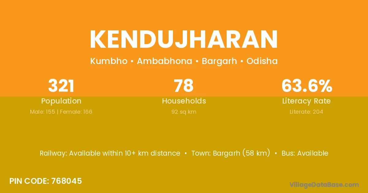 Bargarh (58 km) is the nearest town to Kendujharan village for major economic activities and is located approximately 58 km away.