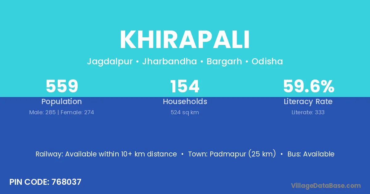 Bargarh (26 km) is the nearest town to Khirapali village for major economic activities and is located approximately 26 km away.