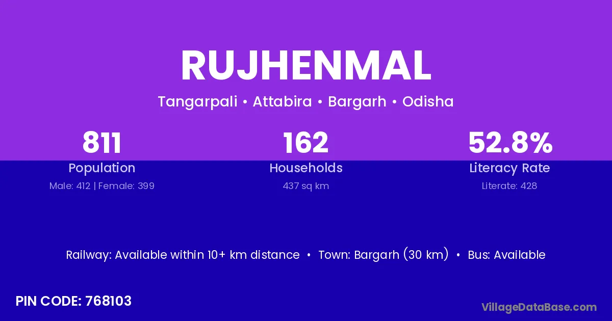 Bargarh (30 km) is the nearest town to Rujhenmal village for major economic activities and is located approximately 30 km away.