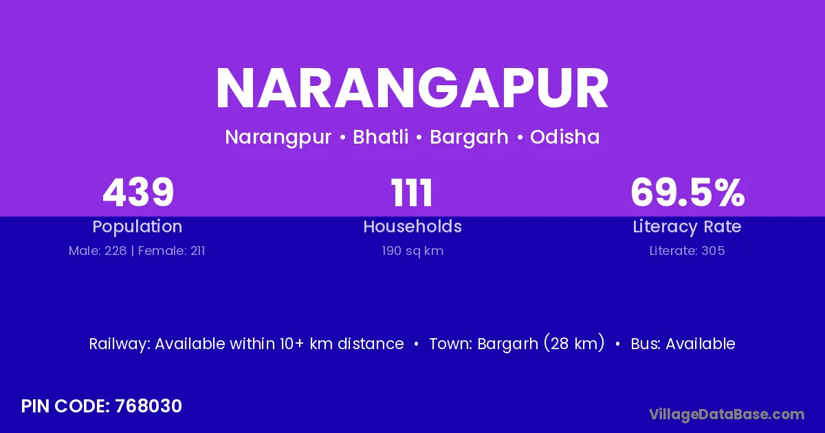 Bargarh (28 km) is the nearest town to Narangapur village for major economic activities and is located approximately 28 km away.