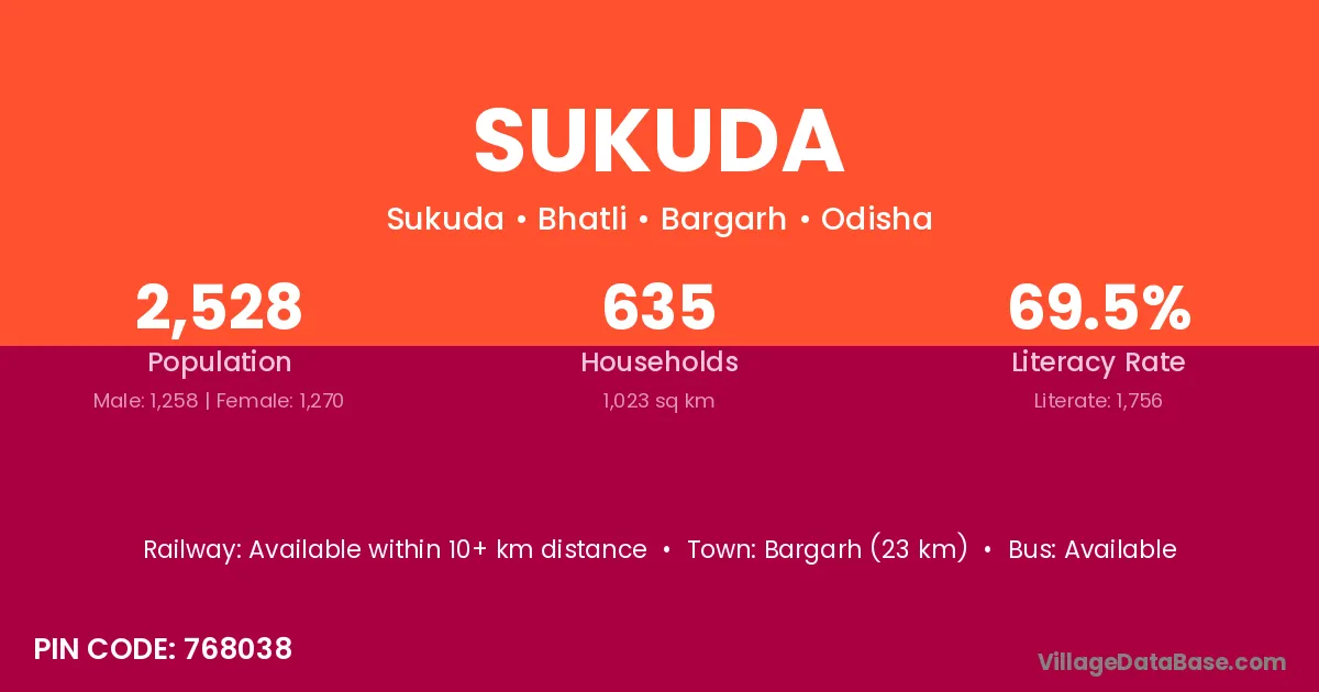 Bargarh (23 km) is the nearest town to Sukuda village for major economic activities and is located approximately 23 km away.