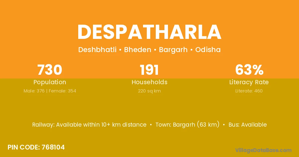 Bargarh (63 km) is the nearest town to Despatharla village for major economic activities and is located approximately 63 km away.