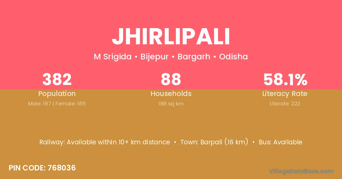 Barpali (16 km) is the nearest town to Jhirlipali village for major economic activities and is located approximately 16 km away.