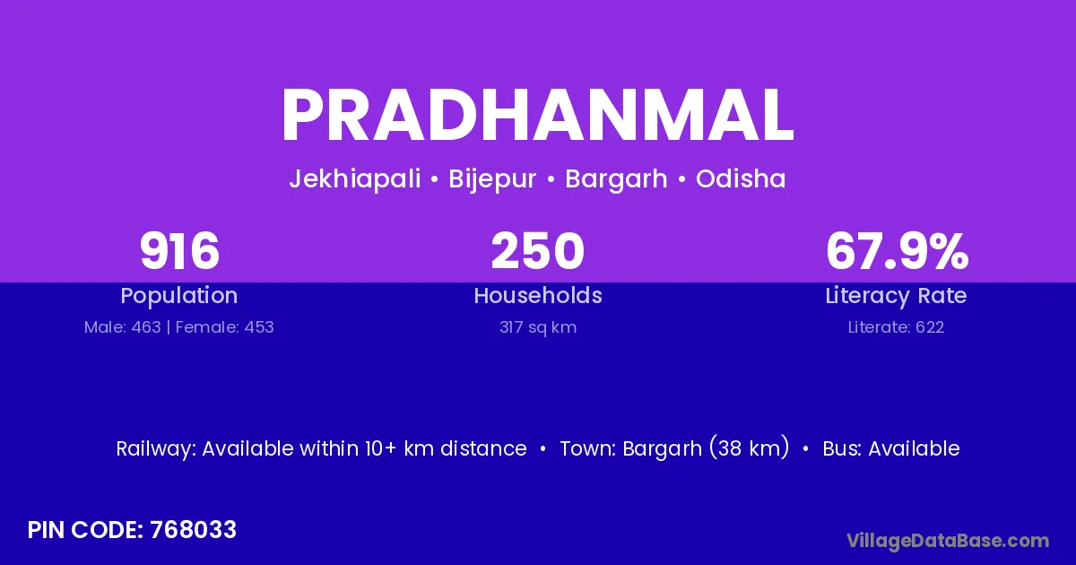 Bargarh (38 km) is the nearest town to Pradhanmal village for major economic activities and is located approximately 38 km away.