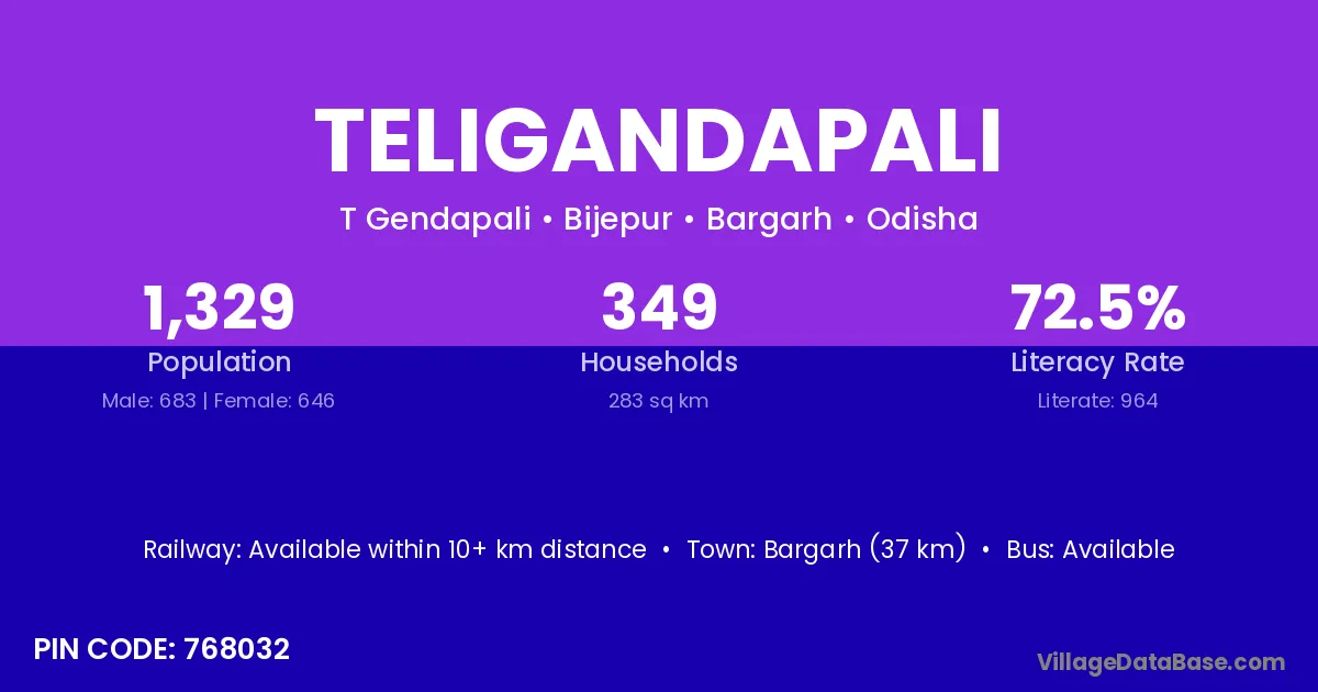 Bargarh (37 km) is the nearest town to Teligandapali village for major economic activities and is located approximately 37 km away.