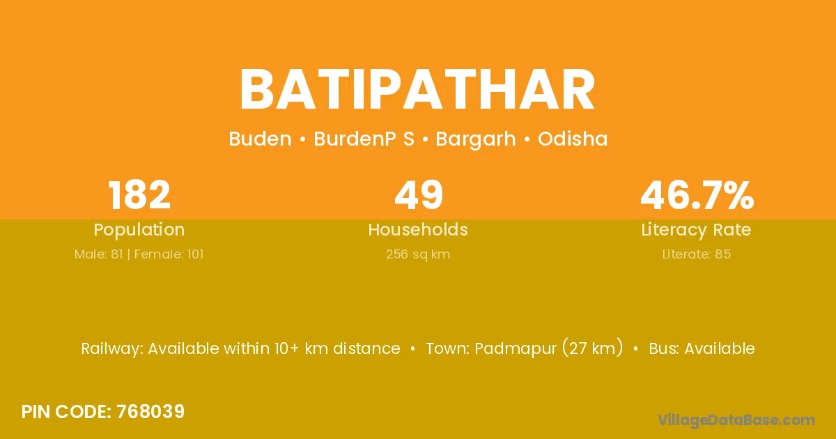 Padmapur (27 km) is the nearest town to Batipathar village for major economic activities and is located approximately 27 km away.