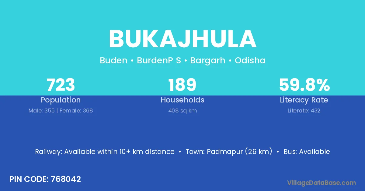 Bukajhula village has a total population of 723 people, of which 355 are males and 368 are females.