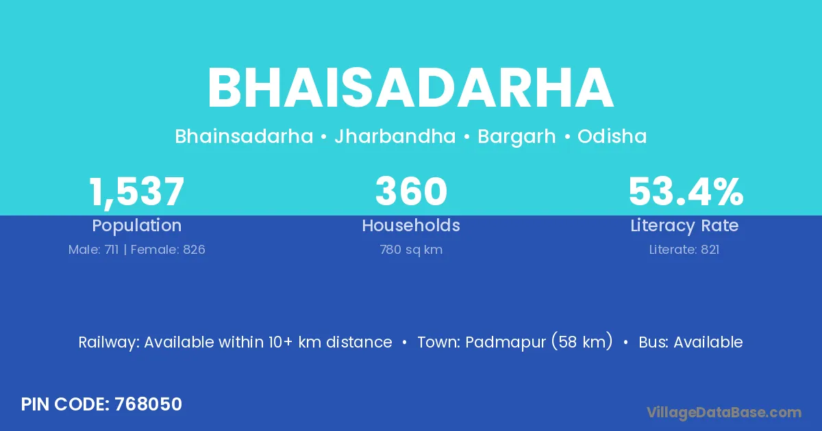 Padmapur (58 km) is the nearest town to Bhaisadarha village for major economic activities and is located approximately 58 km away.
