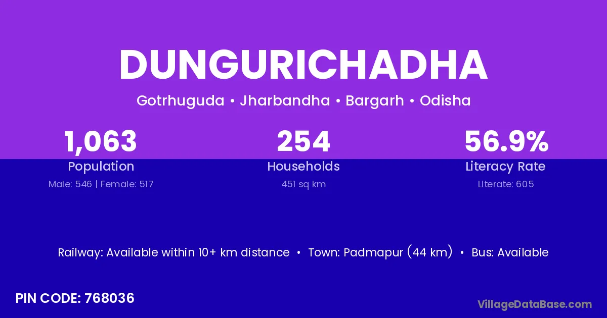 Dungurichadha village has a total population of 1,063 people, of which 546 are males and 517 are females.