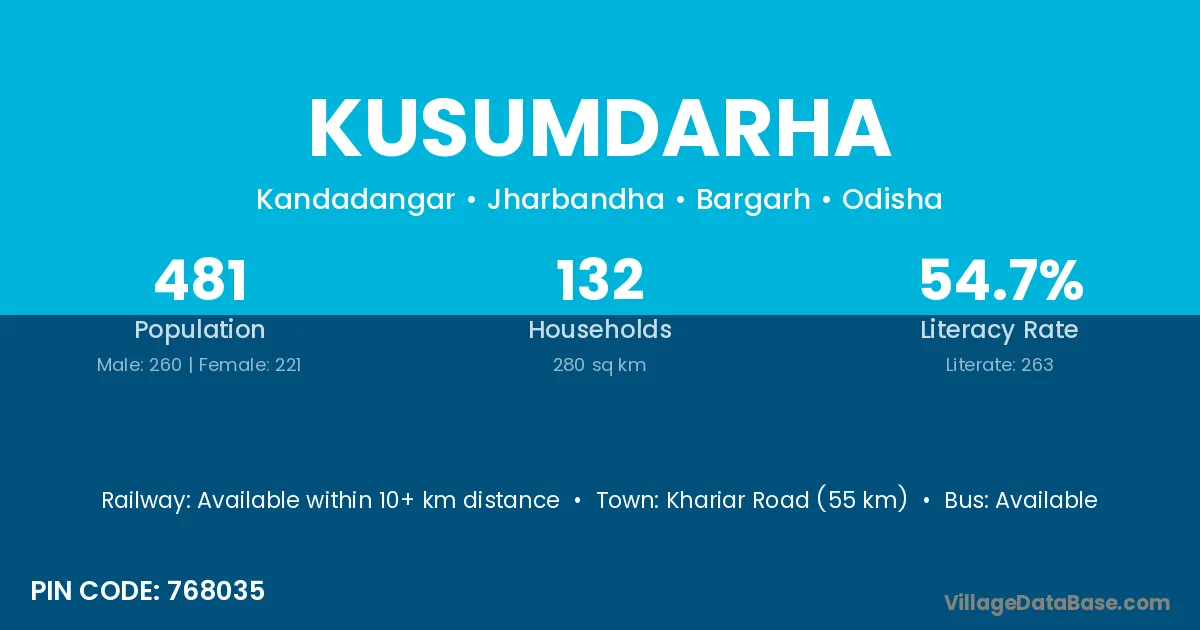 Khariar Road (55 km) is the nearest town to Kusumdarha village for major economic activities and is located approximately 55 km away.