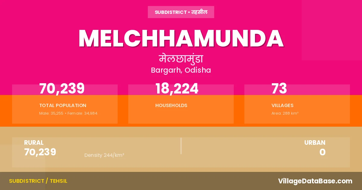 According to the 2011 census The total area of Melchhamunda Tehsil is 288 km², with a population of 70239 people. The population density is 244 inhabitants per square kilometre, and there are approximately 18224 houses in the sub district.