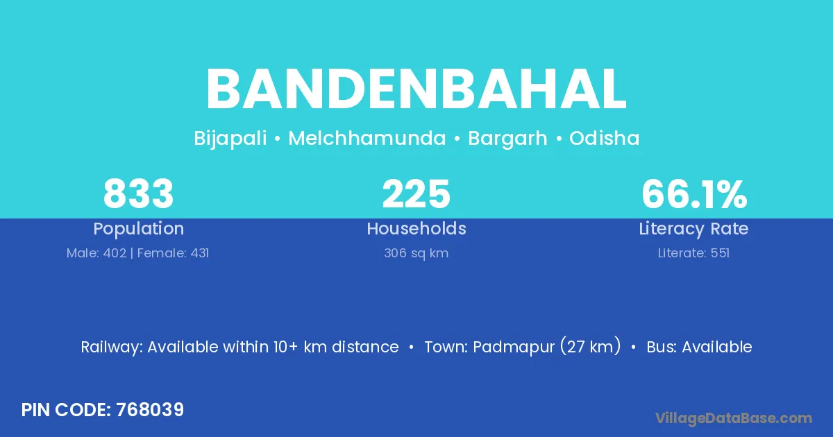 Padmapur (27 km) is the nearest town to Bandenbahal village for major economic activities and is located approximately 27 km away.