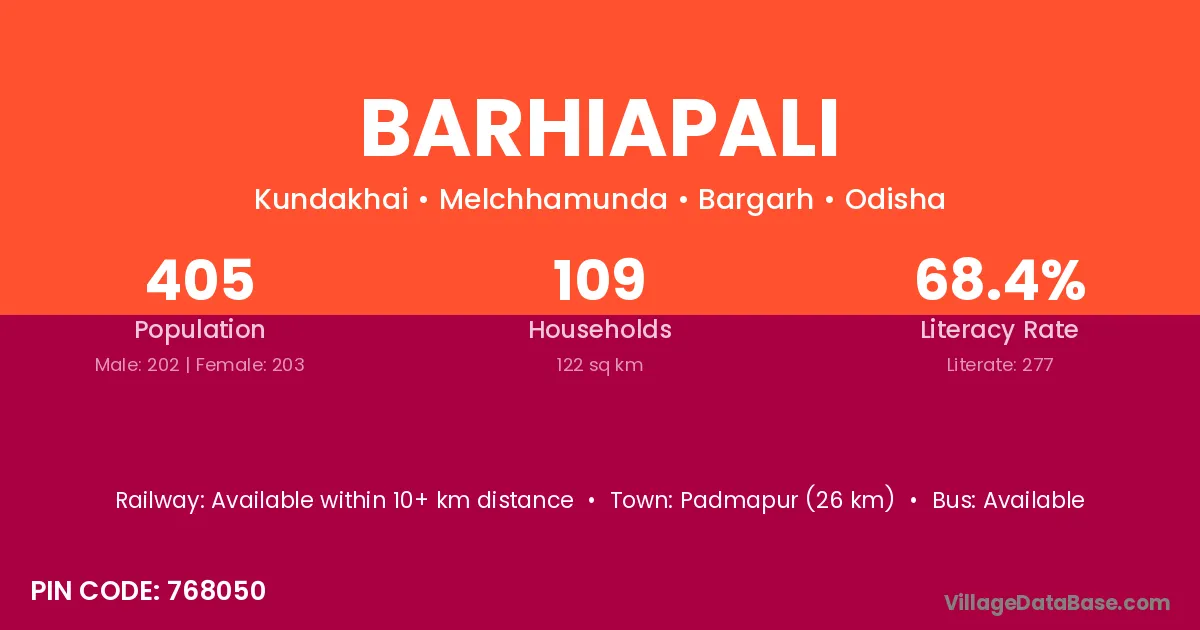 Barhiapali village has a total population of 405 people, of which 202 are males and 203 are females.