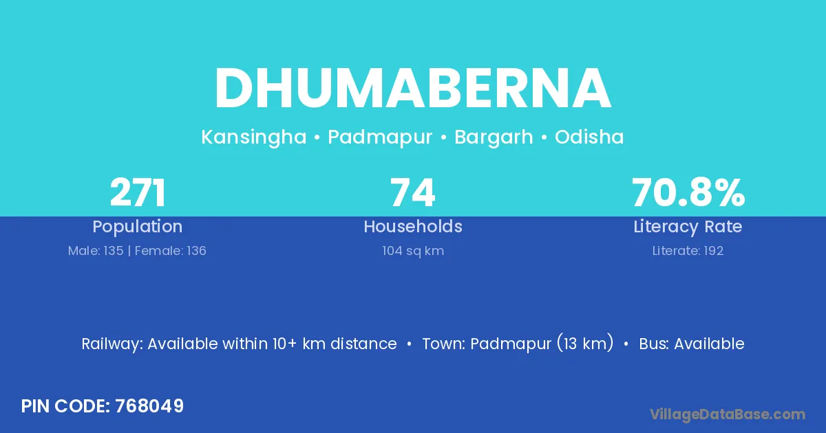 Padmapur (13 km) is the nearest town to Dhumaberna village for major economic activities and is located approximately 13 km away.