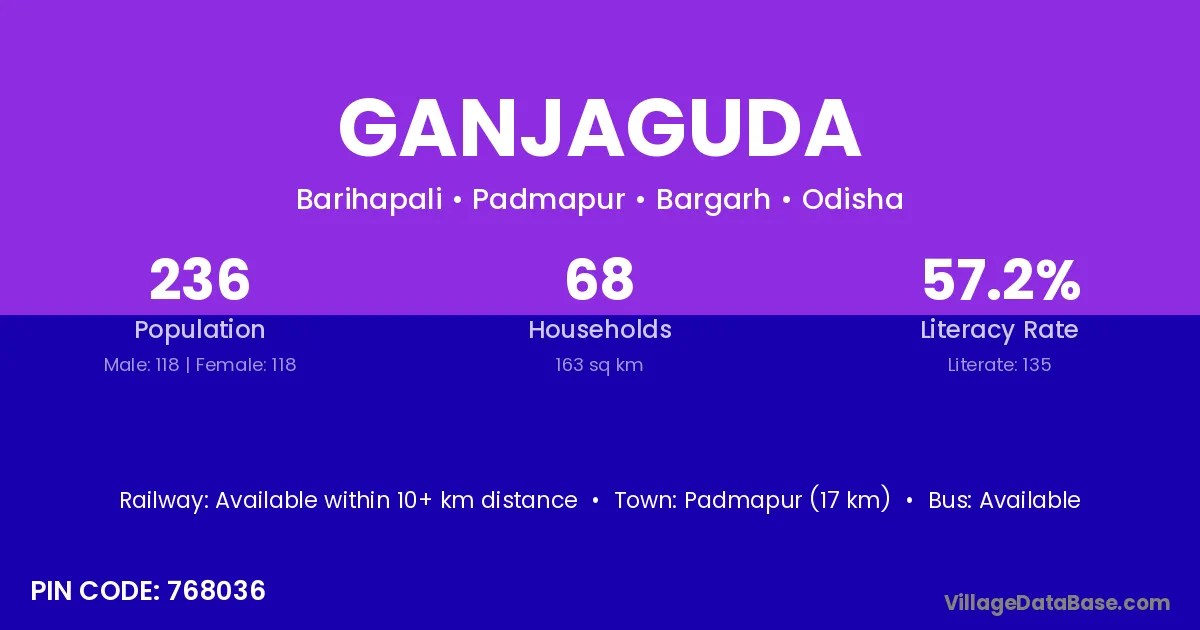 Ganjaguda village has a total population of 236 people, of which 118 are males and 118 are females.