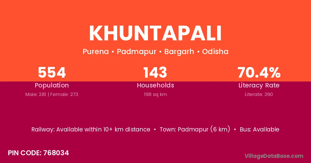 Khuntapali village has a total population of 554 people, of which 281 are males and 273 are females.