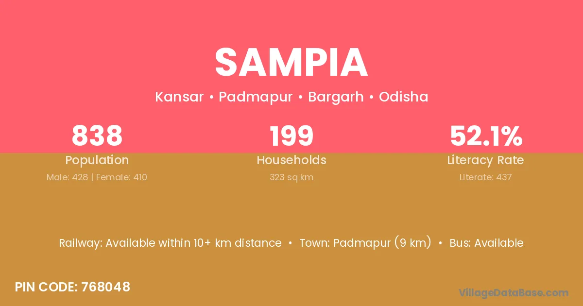Sampia village has a total population of 838 people, of which 428 are males and 410 are females.