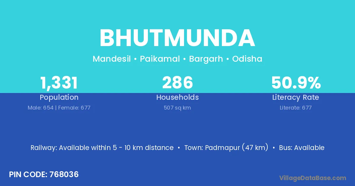 Bhutmunda village has a total population of 1,331 people, of which 654 are males and 677 are females.