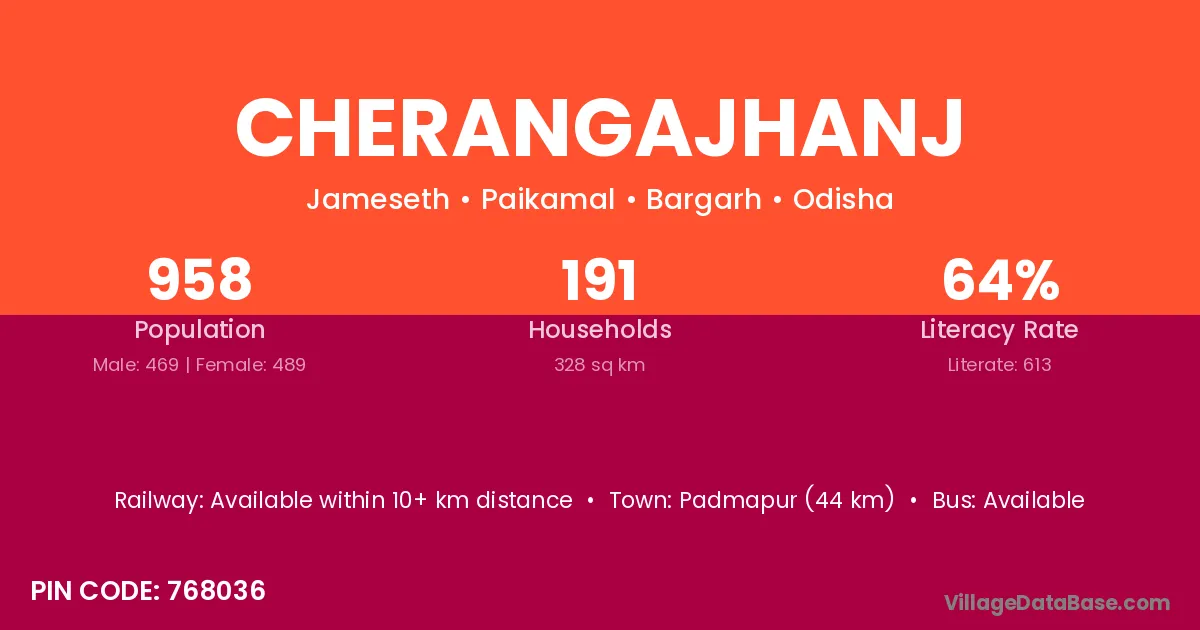 Padmapur (44 km) is the nearest town to Cherangajhanj village for major economic activities and is located approximately 44 km away.