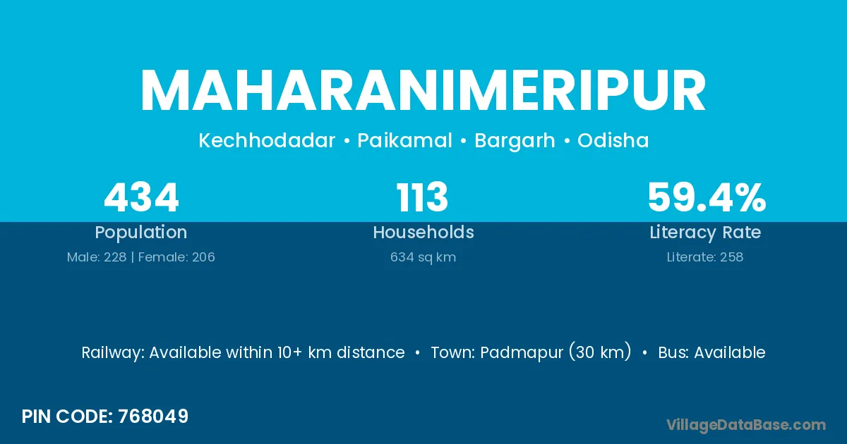 Padmapur (30 km) is the nearest town to Maharanimeripur village for major economic activities and is located approximately 30 km away.