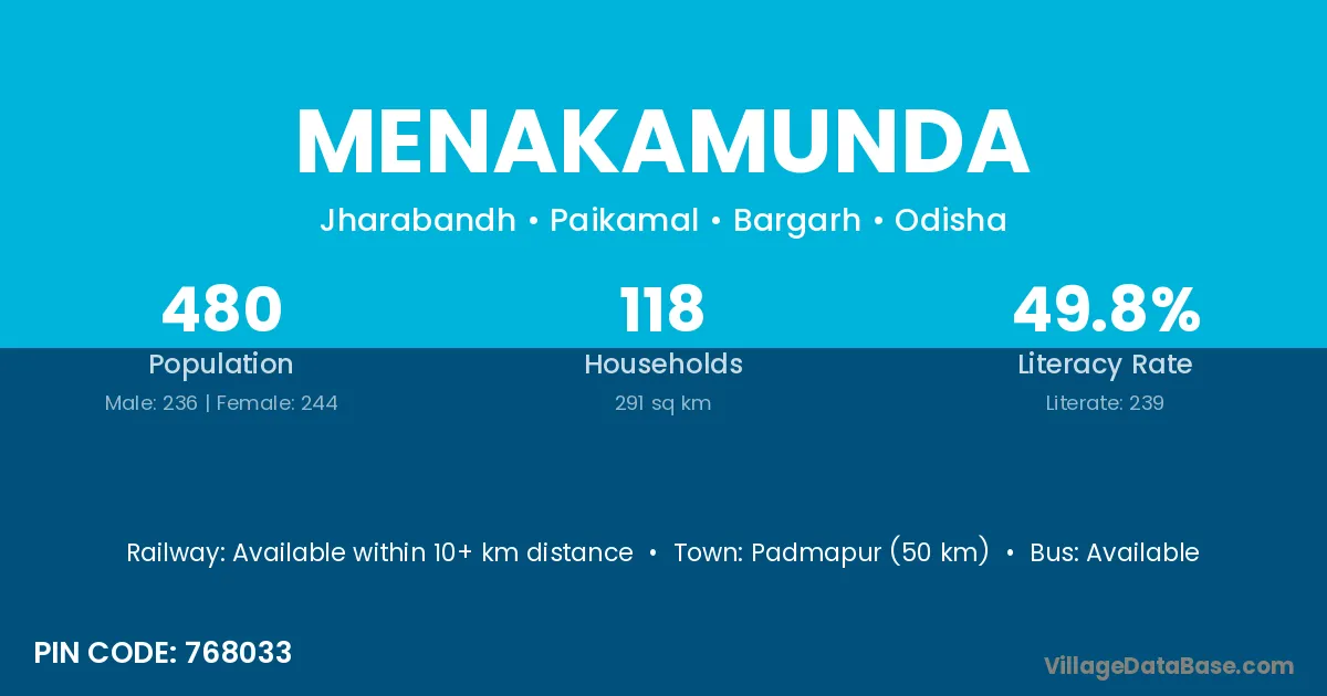 Padmapur (50 km) is the nearest town to Menakamunda village for major economic activities and is located approximately 50 km away.