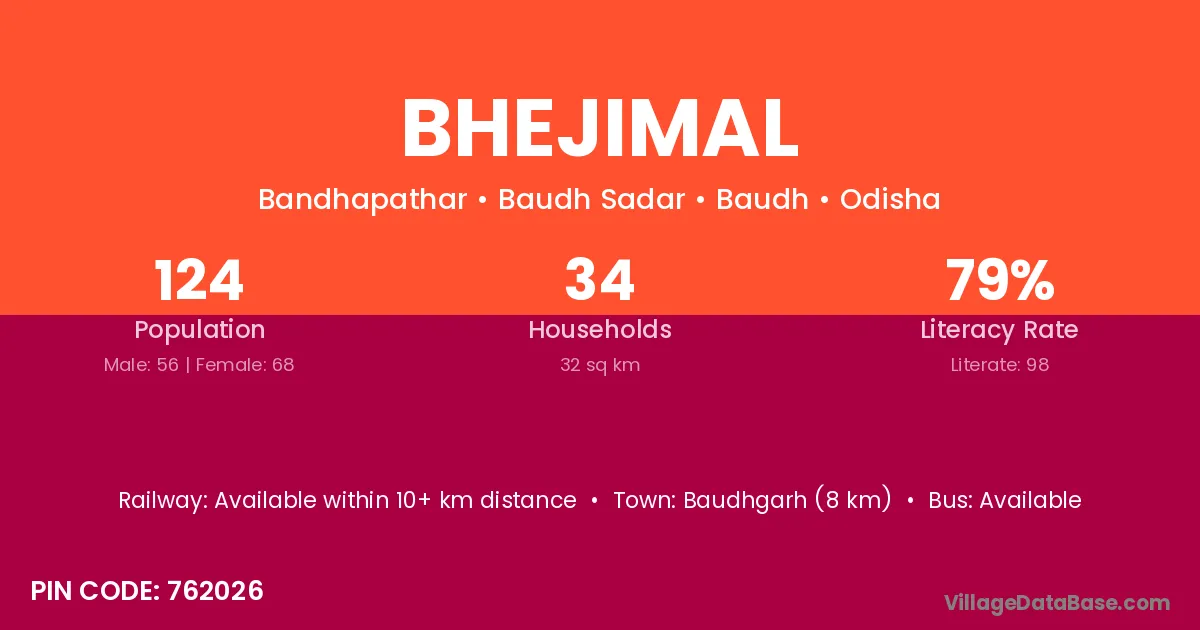 Baudhgarh (8 km) is the nearest town to Bhejimal village for major economic activities and is located approximately 8 km away.