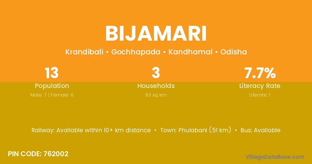 Baudhgarh (42 km) is the nearest town to Bijamari village for major economic activities and is located approximately 42 km away.