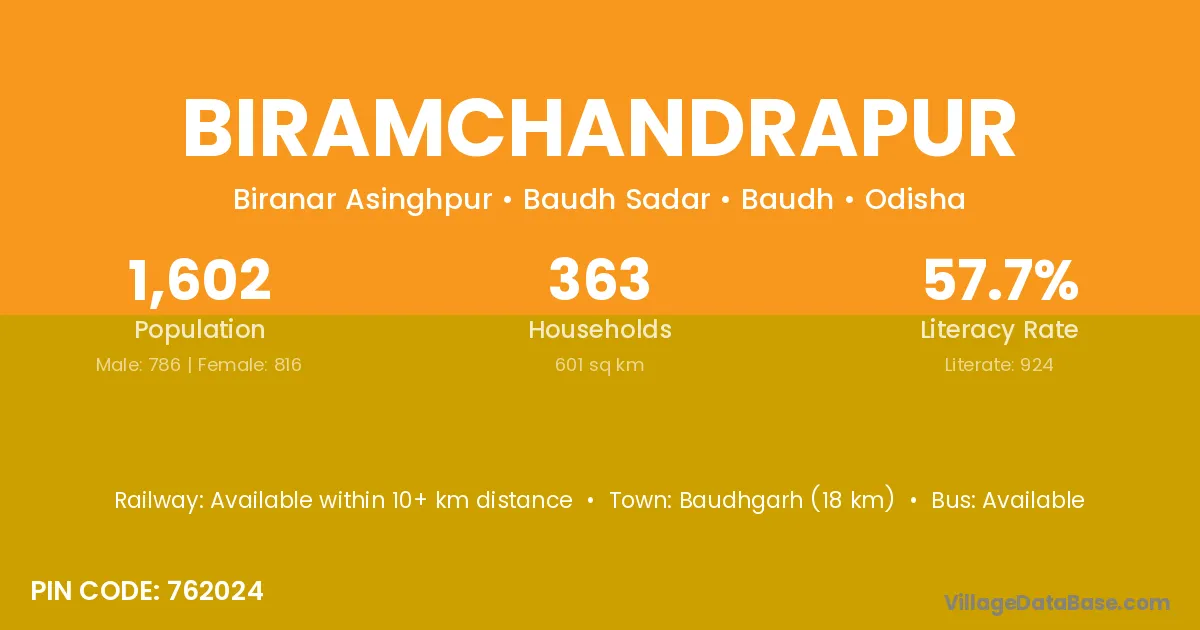 Baudhgarh (18 km) is the nearest town to Biramchandrapur village for major economic activities and is located approximately 18 km away.