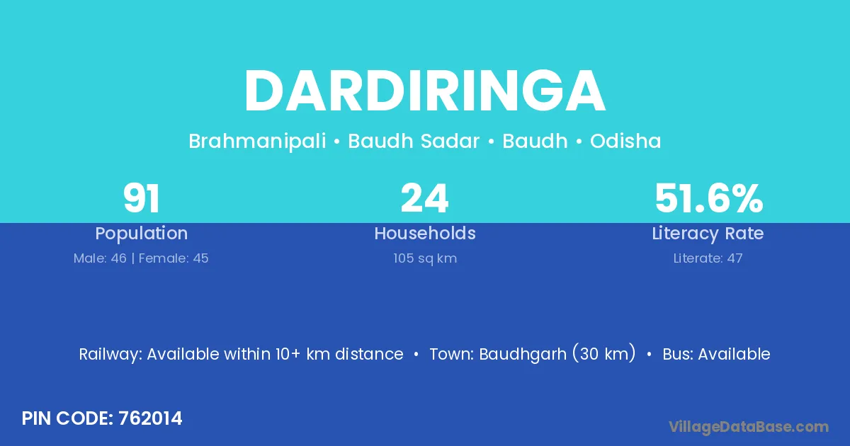 Baudhgarh (30 km) is the nearest town to Dardiringa village for major economic activities and is located approximately 30 km away.