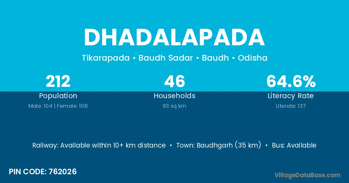 Dhadalapada village has a total population of 212 people, of which 104 are males and 108 are females.