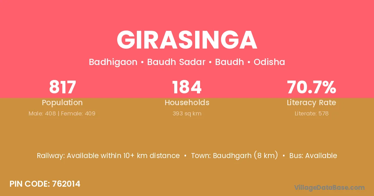 Baudhgarh (8 km) is the nearest town to Girasinga village for major economic activities and is located approximately 8 km away.