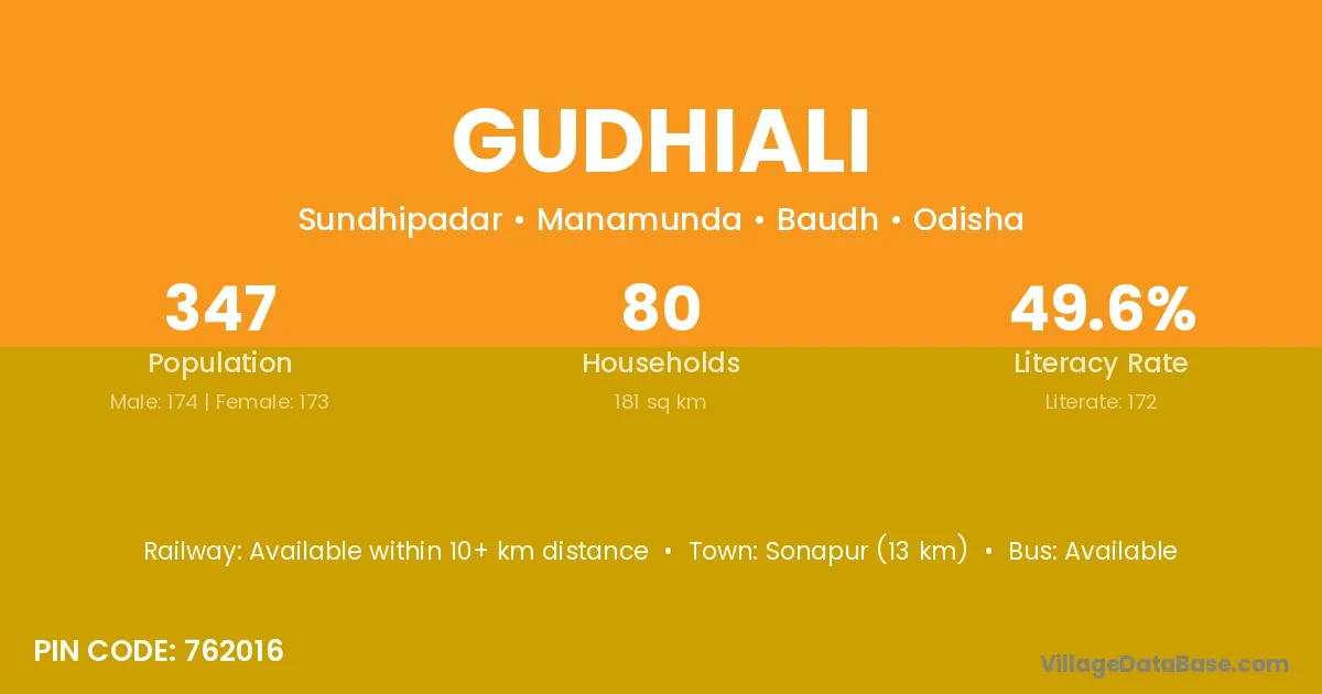 Baudhgarh (18 km) is the nearest town to Gudhiali village for major economic activities and is located approximately 18 km away.