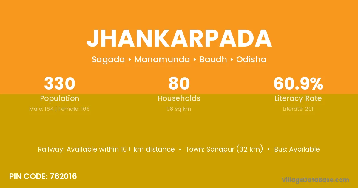 Baudhgarh (40 km) is the nearest town to Jhankarpada village for major economic activities and is located approximately 40 km away.