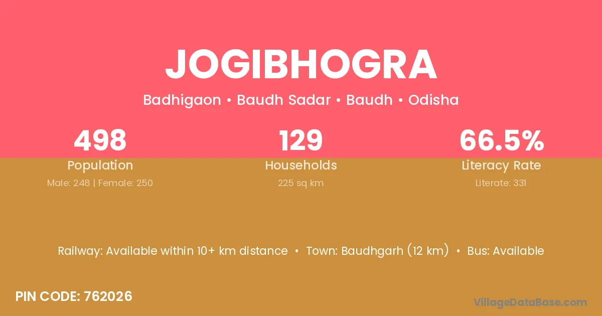Jogibhogra village has a total population of 498 people, of which 248 are males and 250 are females.