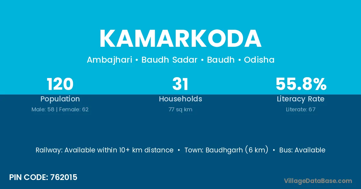 Baudhgarh (6 km) is the nearest town to Kamarkoda village for major economic activities and is located approximately 6 km away.