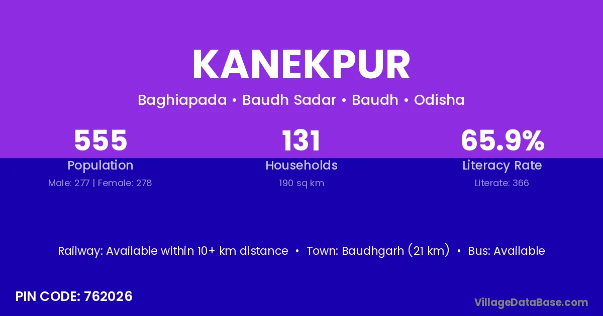 Baudhgarh (21 km) is the nearest town to Kanekpur village for major economic activities and is located approximately 21 km away.