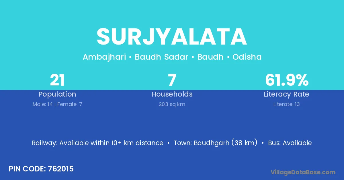 Surjyalata village has a total population of 21 people, of which 14 are males and 7 are females.