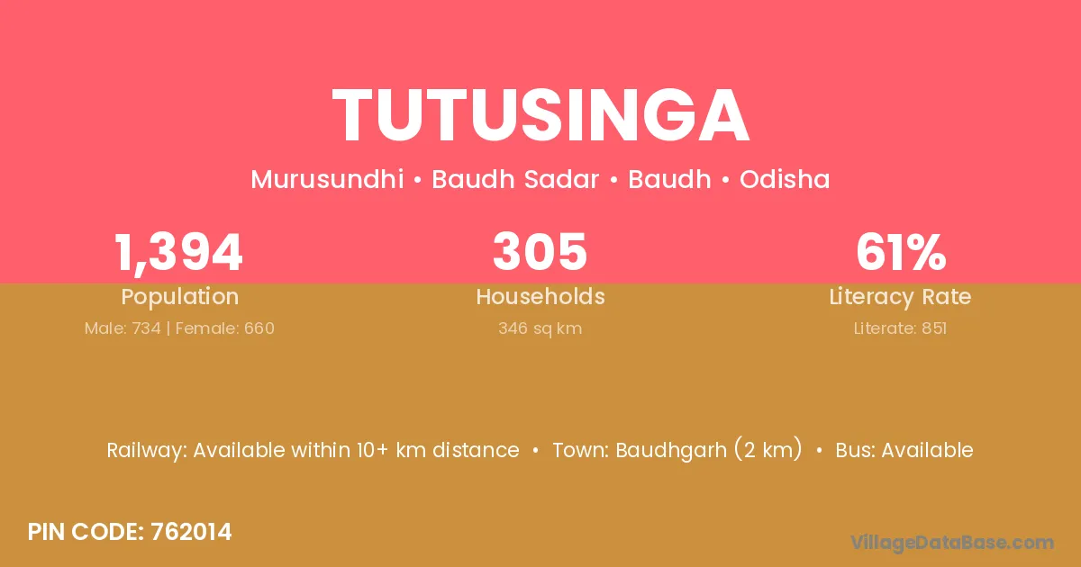 Baudhgarh (2 km) is the nearest town to Tutusinga village for major economic activities and is located approximately 2 km away.