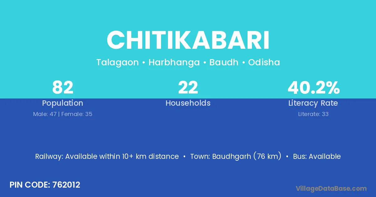 Baudhgarh (76 km) is the nearest town to Chitikabari village for major economic activities and is located approximately 76 km away.