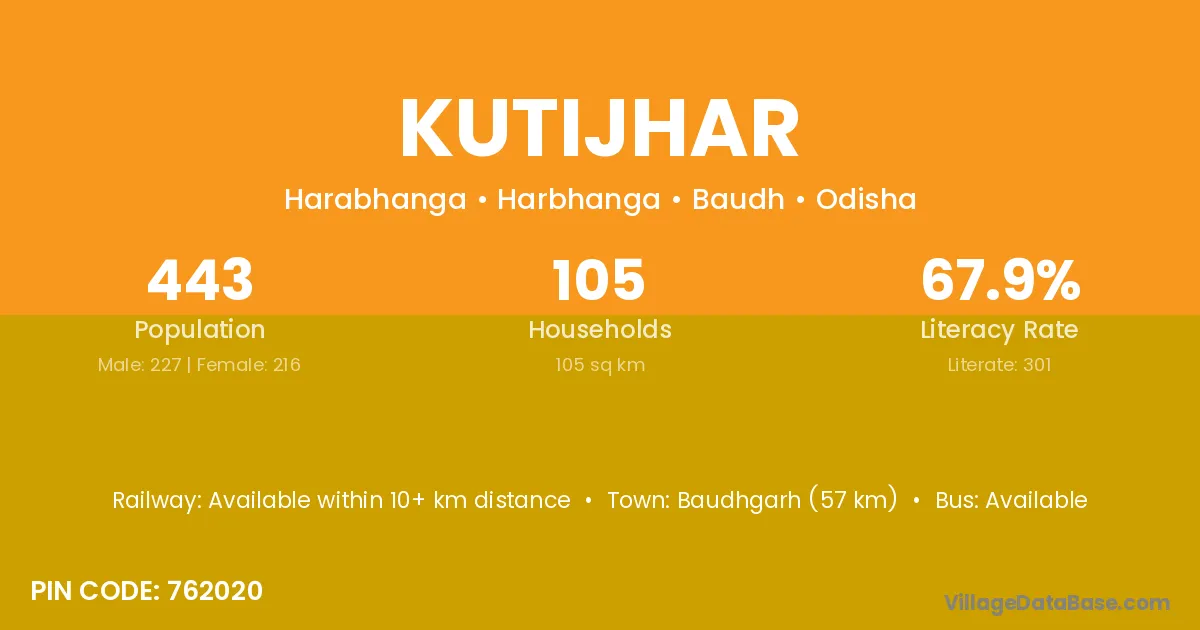 Kutijhar village has a total population of 443 people, of which 227 are males and 216 are females.
