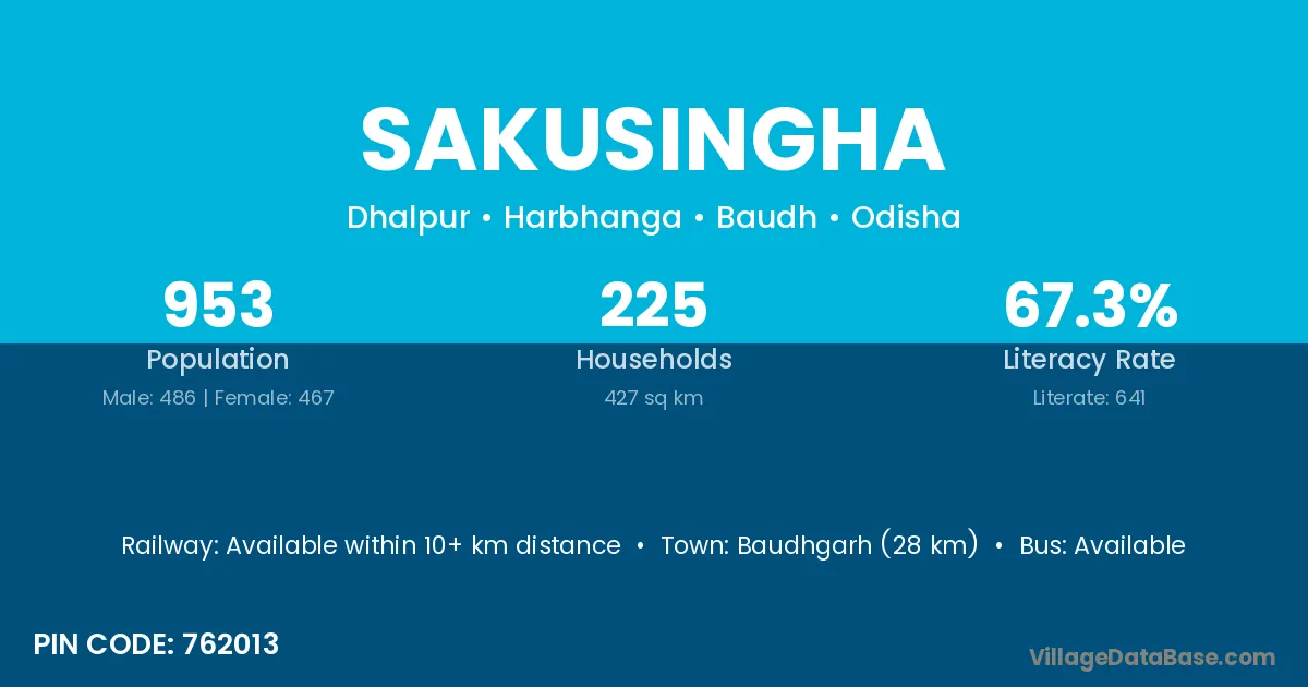 Sakusingha village has a total population of 953 people, of which 486 are males and 467 are females.