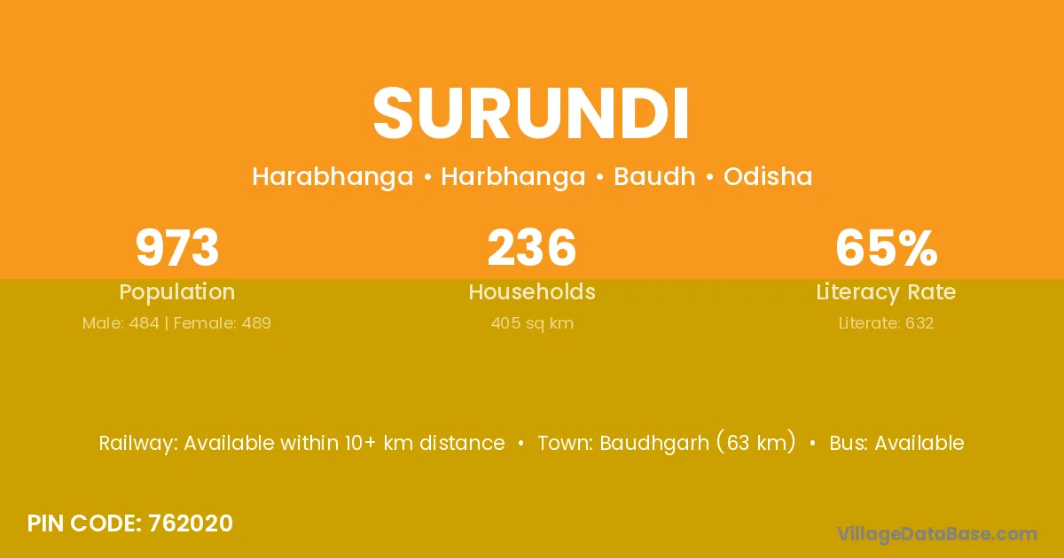 Baudhgarh (63 km) is the nearest town to Surundi village for major economic activities and is located approximately 63 km away.