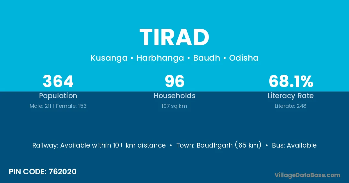 Baudhgarh (65 km) is the nearest town to Tirad village for major economic activities and is located approximately 65 km away.